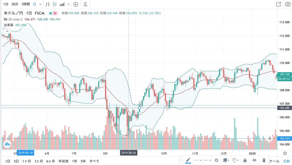 上記のチャートを見て頂くと、十字カーソルの2019年8月26日にドル円が106.68円から