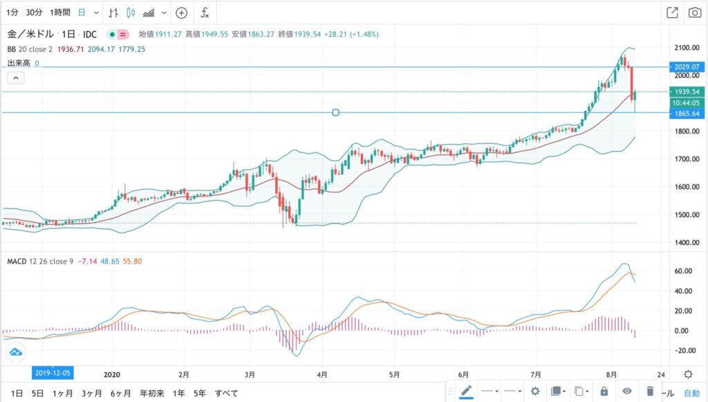 上記のチャートで金価格は2029ドルから1865ドルまで、164ドルの大暴落を記録しました。