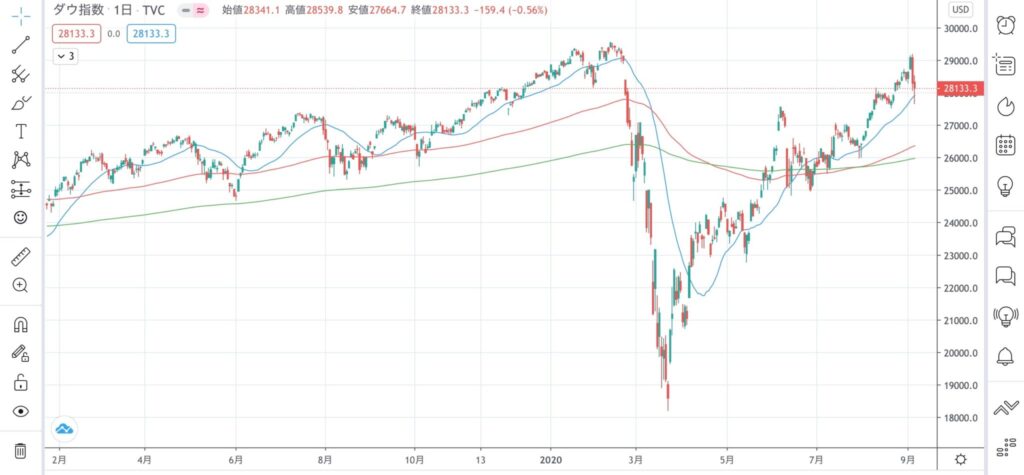 例えばアメリカの株価指数のNYダウのチャートは、、、