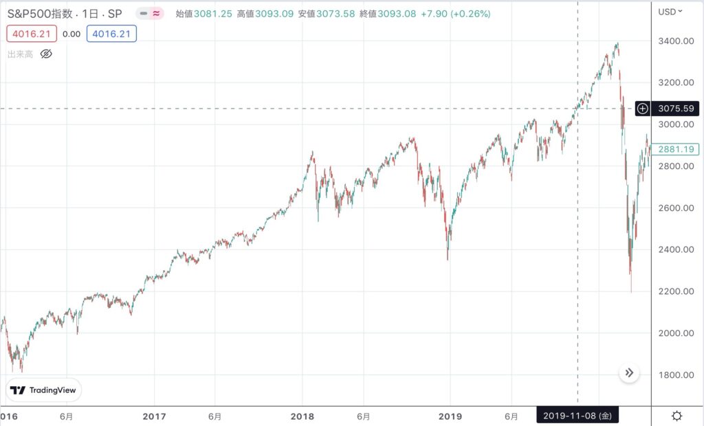 ※上記の画像の十字線が2019年11月8日で、その後の株価の爆上げに参加していた投資家は後に2020年3月のコロナショックで大きな損失を出した人もいました。