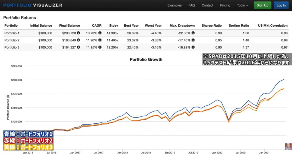 最も配当利回りがよかったのは、SPYDを組み込んだ③。シャープレシオで見た場合には、②が効果的という結果でした。②が最も堅実なポートフォリオと言え、下落時にも強いです。