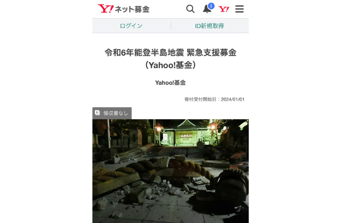 Yahoo!基金にて石川県能登地方で震度7を観測した地震被害に対する緊急支援金の受付を開始されています。