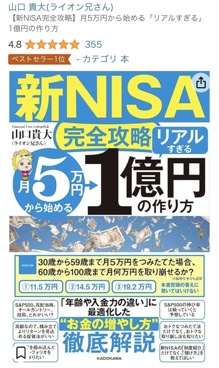 ライオン兄さんの著書「新NISA完全攻略」が1月2日の日経新聞の広告欄に掲載され、Amazon本総合ランキング1位を獲得しました。